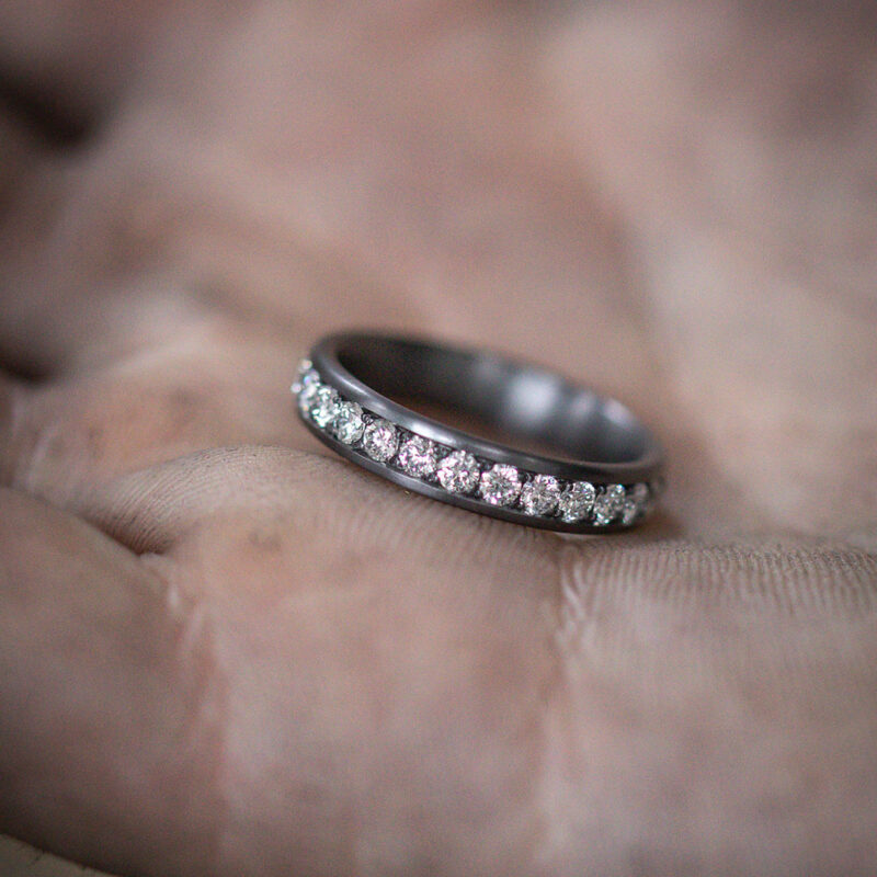 Das anthrazitfarbene Metall gilt als das seltenste stabile Element unseres Sonnensystems. Es ist korrosionsbeständig und besitzt eine hervorragende Hautverträglichkeit – und es ist aufgrund seiner Farbe und des herrlichen Kontrasts zu Diamanten ein wahrer Hingucker!